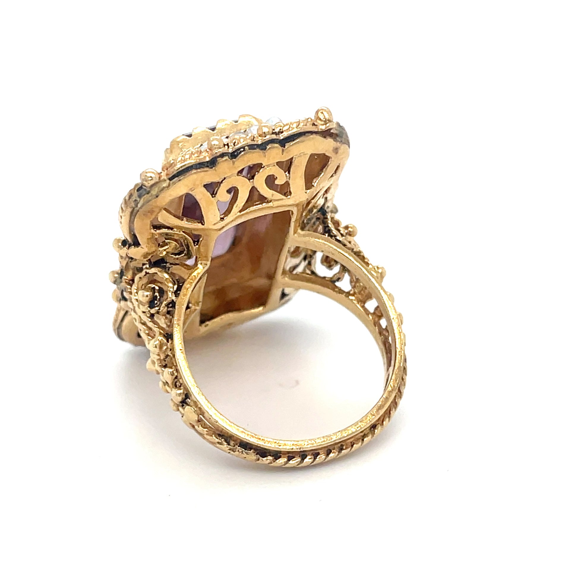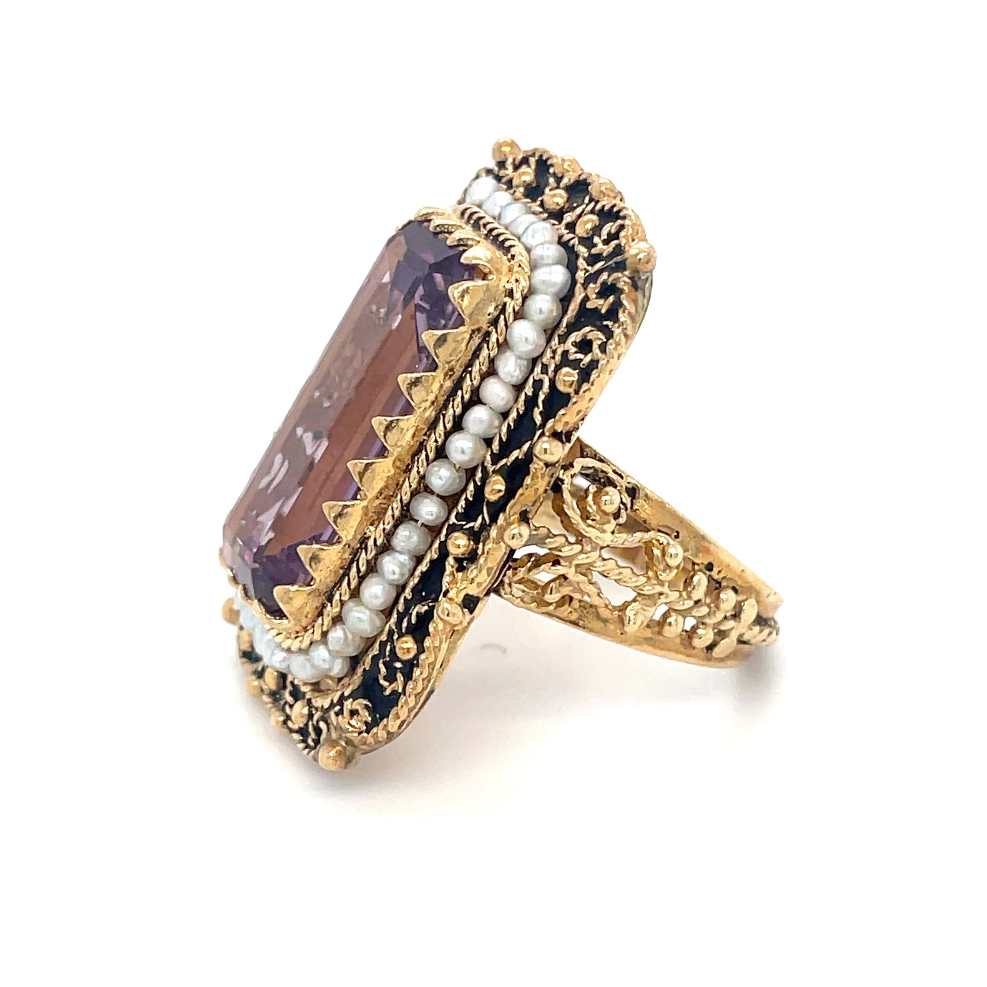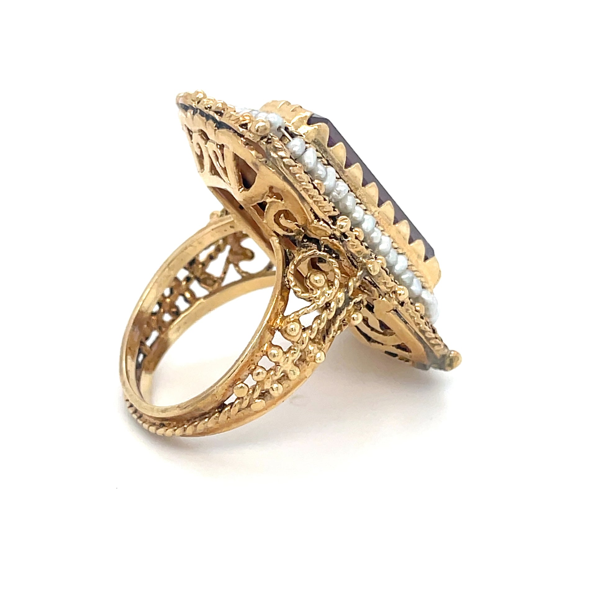 This exquisite Lady Bridgerton Ring is crafted in a Vintage Victorian style, featuring a stunning Amethyst stone and lustrous natural freshwater pearls. Available in size 8 1/2, with the option for resizing upon request.
